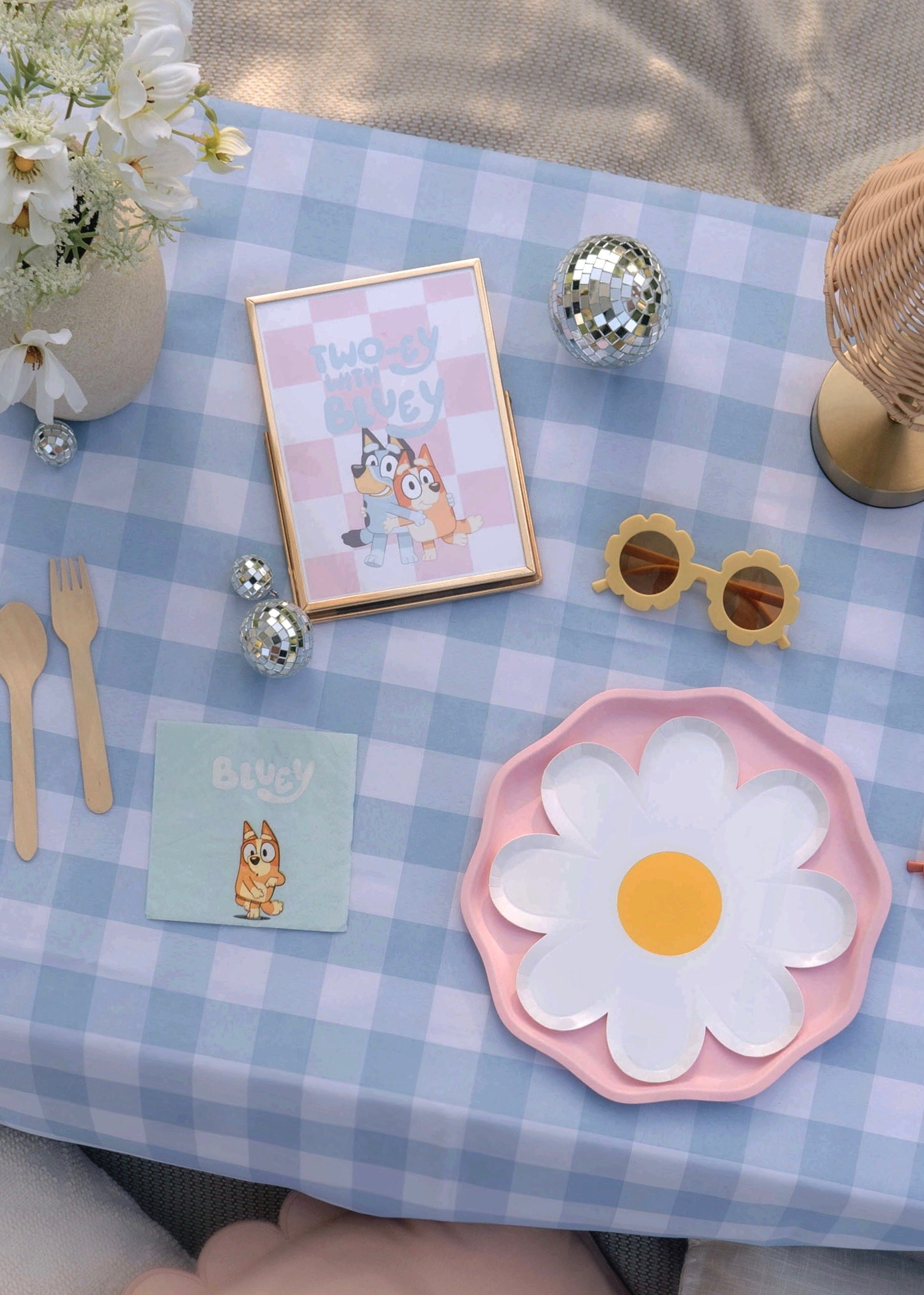 An earthy setup with green gingham and natural rattan accents; perfect for engagement photoshoots, dates, or family gatherings.